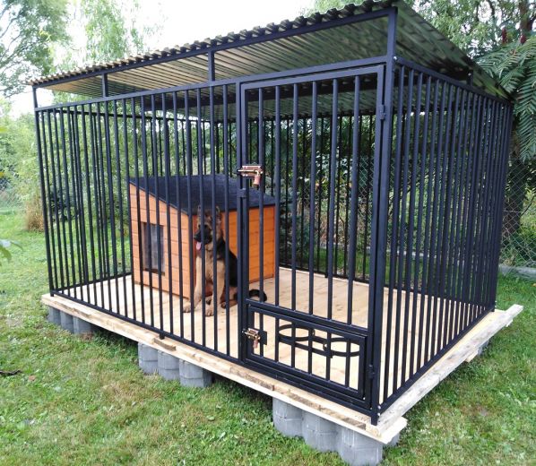 Kojec w całości wykonany jest z profili zamkniętych oraz rurek. Całość malowana na kolor czarny farbą podkładową antykorozyjną. Kojec zadaszony jest blachą trapezową ocynkowaną. Furtka w standardzie umiejscowiona jest z prawej strony.