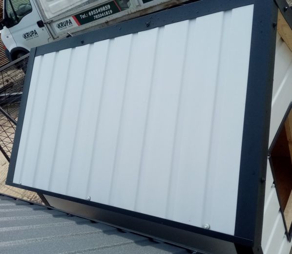 - Poszycie z blachy trapezowej t-7 w kolorze białym z grafitowymi okuciami, nadające budy elegancki wygląd oraz zapewniające ochronę przed warunkami atmosferycznymi.