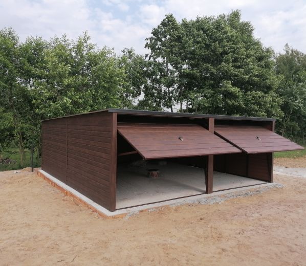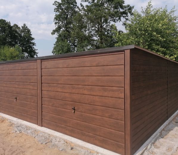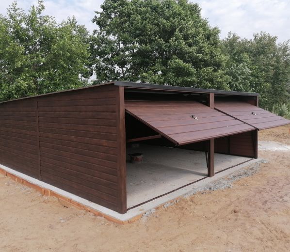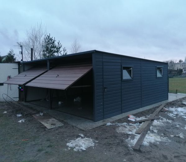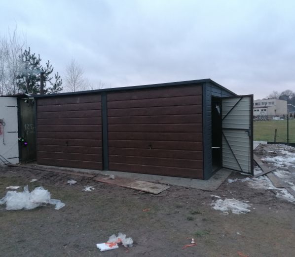 Poszycie ścian wykonane z blachy trapezowej T-7 w kolorze RAL ( brąz, antracyt, czarny lub biały )