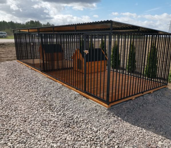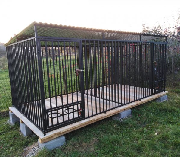 Kojec w całości wykonany jest z profili zamkniętych oraz rurek. Całość malowana na kolor czarny farbą podkładową antykorozyjną. Kojec zadaszony jest blachą trapezową ocynkowaną. Furtka w standardzie umiejscowiona jest z prawej strony.