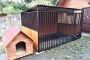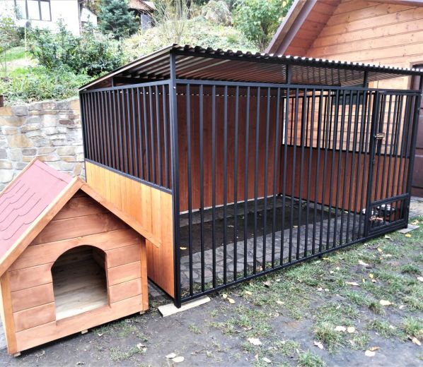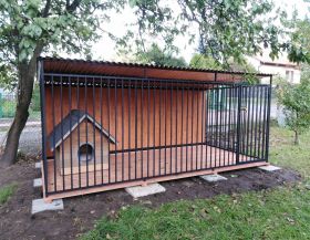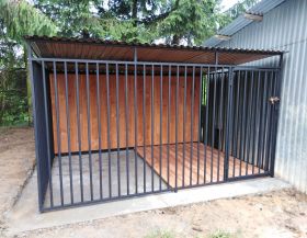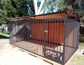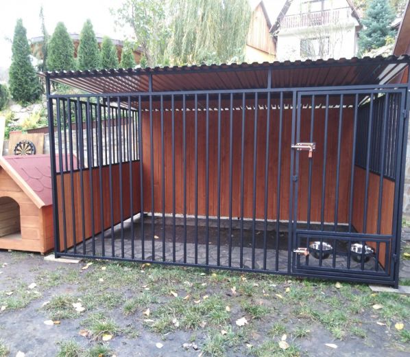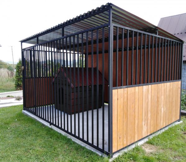 Kojec w całości wykonany jest z profili zamkniętych oraz rurek. Całość malowana na kolor czarny farbą podkładową antykorozyjną. Kojec zadaszony jest blachą trapezową ocynkowaną. Furtka w standardzie umiejscowiona jest z prawej strony. Tylna ściana kojca w całości zabudowana drewnem. Boczne ściany do połowy zabudowane drewnem. Drewno zabezpieczone drewnochronem w kolorze tik.