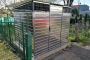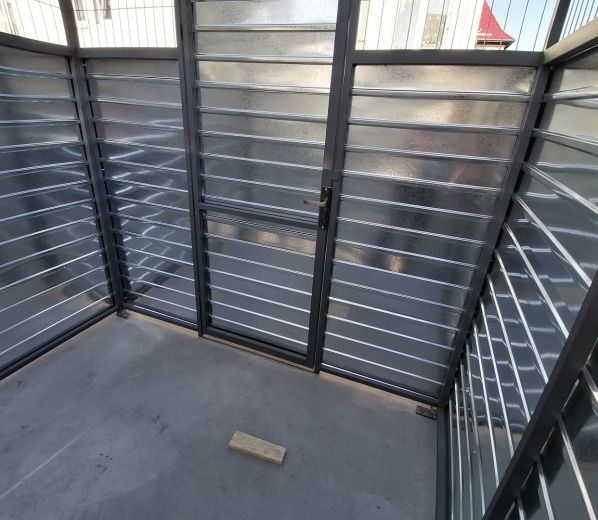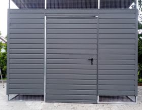 Wiata w całości wykonana jest z profili zamkniętych ocynkowanych. Konstrukcja w standardzie zadaszona jest blachą trapezową ocynkowaną. Drzwi o szerokości 1,2 m umiejscowione są z prawej strony.